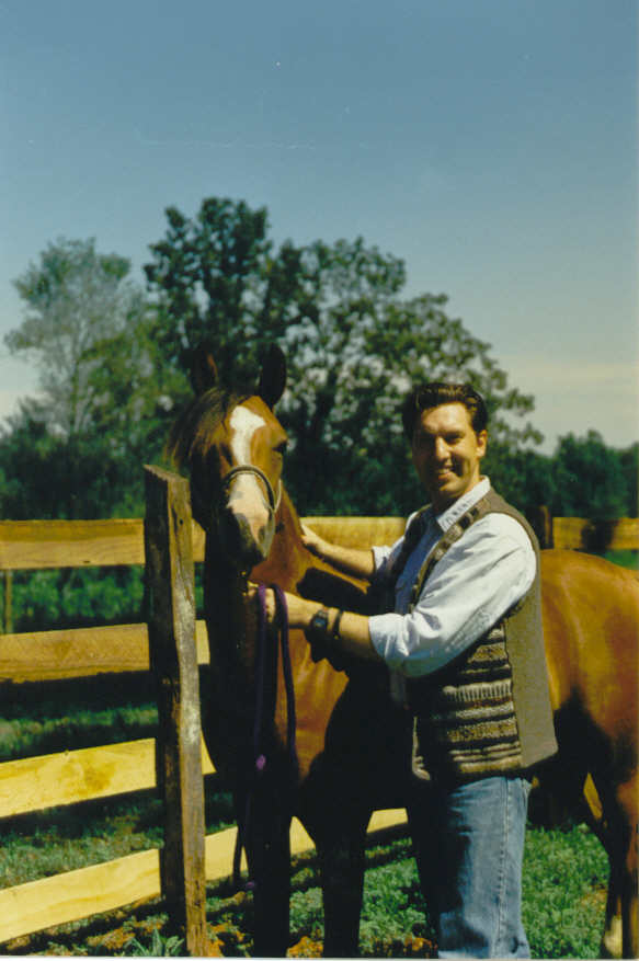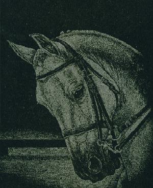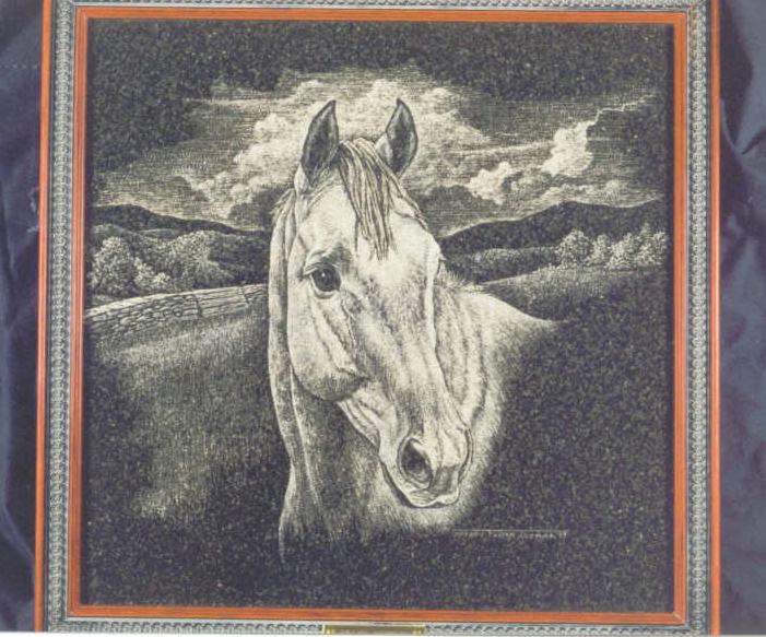 Killy's Ranger, Irish Thoroughbred (Hand-Etched Black Granite in Cherry Frame) Jeffrey Foster Thomas, Artist-Private Collection of Bob and Lisa Bezzeg