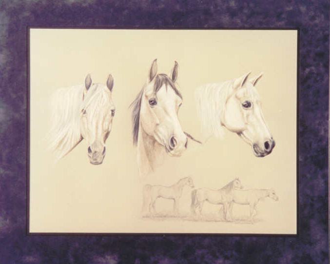 Arabian Family; Ixe(Arabian Stallion), Sassy(Half-Arabian Filly), Sunny(Half-Arabian mare), Colored Pencil Portrait-Jeffrey Foster Thomas, Artist-Private Collection of Mike and Regina Vaickus. This portrait features a pencil sketch in the lower right-hand corner showing all three horses.