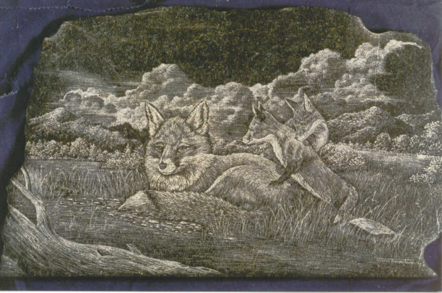 Vixen and Kits (Hand-Etched Black Granite Shard) Jeffrey Foster Thomas, Artist. This piece is etched onto a broken slab of black granite and stands on an easle.
